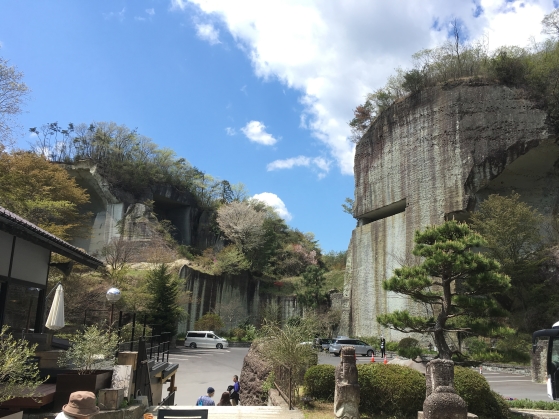 大谷資料館のある一帯は、大谷の奇岩群として国の天然記念物に指定されています。こちらの場所は大谷資料館の入り口近くにある大谷景観公園です。切り立った崖に立つ木々や迫力のある岩肌はまるで絵画のような風景。