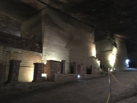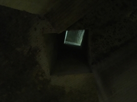 | 高い天上に四角く空いた穴から差し込む地上からの光。自分が今どのくらいの深さに居るのかを確認するための穴だそうです。 | お馴染みの大谷石の門柱が並んでいます。 |
