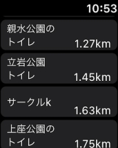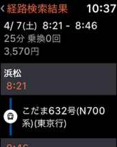 | 電車での移動では、「乗換案内」などのアプリが役立ちます。Apple Watch単体で検索は出来ませんが、直近の検索結果が表示されます。都市部で複雑な乗り換えに悩まされる地方民にとっては救いです。 乗り換え案内系では、他に「駅すぱあと」、「乗換ナビタイム」、「Yahoo!乗換案内」があってとても充実しているジャンルです。それぞれ微妙に機能やUIが異なっていたりしますので、使い比べて常用アプリを選んでみるのも良いかもしれません。 | ![]() |