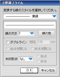 今回の改良では、左図のダイアログが表示され、注釈線のタイプを細かく設定できるようになっています。当然、設定後の編集も可能になっています。
