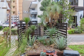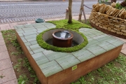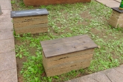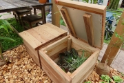 ![]() 版築を土台に使っているなんとも贅沢なベンチ。しっかりした技術があってこその様々なチャレンジ。 | ![]() ベンチの座面に竹を利用。コケと水鉢のイメージと相まって、モダンな和の演出です。 | ![]() ナチュラルテイストのエディブルガーデン、キッチンガーデンには欠かせないコンポスト。ベンチにすることで普段は目立たなく。 |