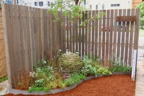 | 板塀を背景に、アンティークレンガとコッツランドストーンを無造作に配置することで、一瞬にして生活感溢れる庭の一角を演出。廃材の木製窓もアクセントとして面白い使い方がしてあります。 | ![]() |