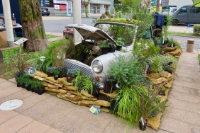 ![]() | 廃車を持ち込んで非常に手の込んだ小庭を造作したのは、なんと京都からの参加者、亀山造園さんです。おそらく一番遠方から見えたのではないでしょうか。 野草にあふれかえった空き地に置き去りにされたローバーミニ、いつしかボンネットから草が生え、ルーフにコケも着く、そんなイメージですが、ボンネット内は溶岩で組んだ流れがあり、ルーフの苔庭はちゃんと盆石まで配置してあります。ここはやはり庭師の矜持でしょうか。 |