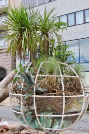 | こちらも目を惹いた巨大なオブジェ。 おそらく公園や幼稚園からの払い下げと思われる遊具を利用して、ユッカやアガペなどを植栽。しかしよくよく見ると、下半分は水槽になっていて魚が泳いでいます!アクリル樹脂などをカットして遊具に沿わせて貼り込み、コーキングしたものと思われます。ドライガーデンによく使われる樹種を置きながら全然ドライじゃない、なんとも不思議はオブジェに仕上がっています。 | ![]() |