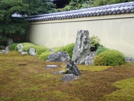 中央東側の楕円で囲まれた苔が白砂に映えて美しく、北側の龍吟庭とは対照的に明るい雰囲気で、独創的かつ斬新な枯山水です。