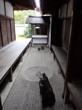 書院の次は方丈に向かいますが、その途中に庫裡と方丈に挟まれた場所に小さな石庭があります。5個の石のみで構成された簡素な壷庭で、「東滴壺(とうてきこ)」と呼ばれ、日本最少の石庭です。1960年の作で壺庭の傑作といわれています。