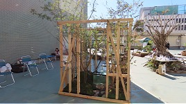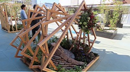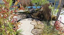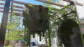 ![]() 豊田市 神谷造園の作品「パラメトリックな庭」。角度が変化しつつ連なる木製フレーム、石材がパラメトリックのイメージでしょうか。 | ![]() HPを拝見すると、石材の扱い、特に石積みが得意な造園家ですね。 |