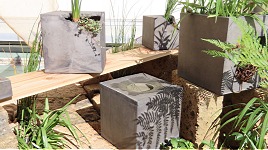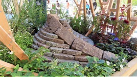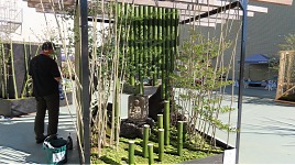 ![]() 京都府 亀山造園の作品「破壊と再生」。 今回割と若い方が多い様ですが、亀山さんはもうベテランですね。 テーマは廃材利用から来ているとか。 | ![]() 中空の石からは水のしたたり。これペットボトルから作った石なのだそうです。リアルなものも、コンセプトをわからせるため敢えて粗い造りのものも。 |