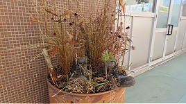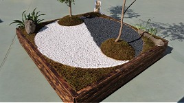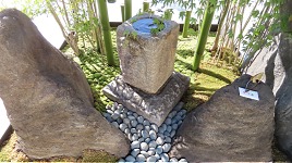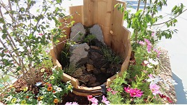 ![]() 弥富市の薫風舎 「未来への階(きざはし)」。木工も得意な造園家。 | ![]() 階(きざはし)は、木の立板の部分でしょうか。コスモスもキレイですね。木桶の中に滝組が。小さな大自然です。 |