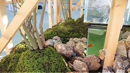 ![]() 名古屋市の造園家 東海園の作品「遊魚苑」。木製の枠の中には… | ![]() なんと水槽がいくつも。非常にユニークですね。 |