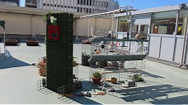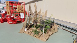![]() | こちらも協賛社ブース。石材を扱う おしゃ楽のブースです。 ガビオン(石材を詰め込んだ蛇籠)をメインとした展示になっていますが、ベンチや門柱、プランターボックス、テーブル等様々なアイテムに活用しています。 |