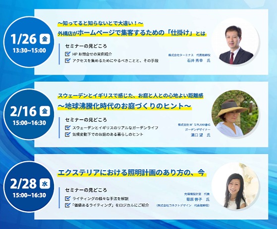 開催いたします。1〜2月でホームページ集客、スウェーデンとイギリスのガーデンライフの体験に基づいたお庭のある暮らし、エクステリアの照明計画の3本立てのセミナーです。