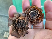 | 右の画像が、ヒマラヤスギの松ぼっくり。 なんとなくバラの花に見えませんか? 元は丸っこい松ぼっくりが生るんですが、外側のカラ(「果鱗(かりん)」と言います)が段々と取れて、このようにバラの花に似てくるとのこと。 そのため「シダーローズ」の異名がつきました。 | ![]() |