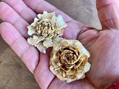 ![]() | なんだか見ているだけで、色々なイメージが湧いてきますよね。 クリスマスリースでワンポイントに使ってみたら、とても可愛らしそうです。 色も似せてみたいなと思って、今脱色とか試しています。 キッチンハイターなどの漂白剤に一晩漬けて、乾燥させると、見事白いバラが出来上がりました。 これに染料で色を付けてみても面白いかもしれません。 |