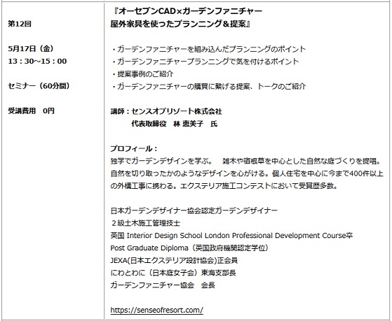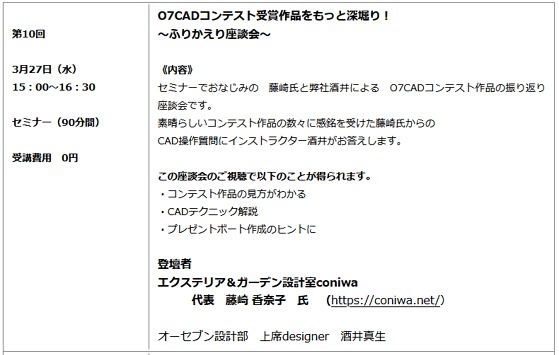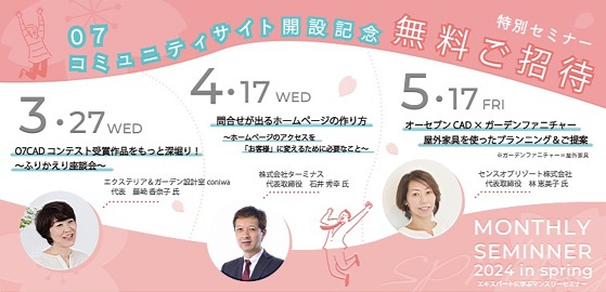エキスパートに学ぶスペシャルな マンスリーセミナー(春) を2025年の30周年に向けた「Gofor30th」プロジェクト感謝祭と題しまして、無料で開催いたします。3〜5月でCADとホームページに関するセミナーの3本立てです。3月は、07CADコンテスト受賞作品をもっと深堀り!〜ふりかえり座談会〜です。