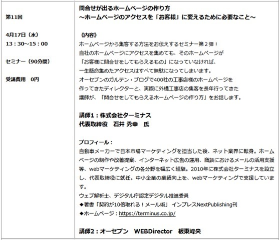4月は問合せが出るホームページの作り方〜ホームページのアクセスを「お客様」に変えるために必要なこと〜です。